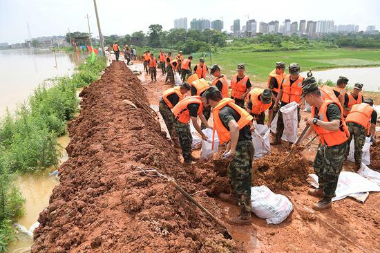 武警江西总队机动支队官兵闻令而动,驰援上饶市鄱阳县江家岭村昌江圩堤坝抢修堤坝,图为官兵正在加固堤坝