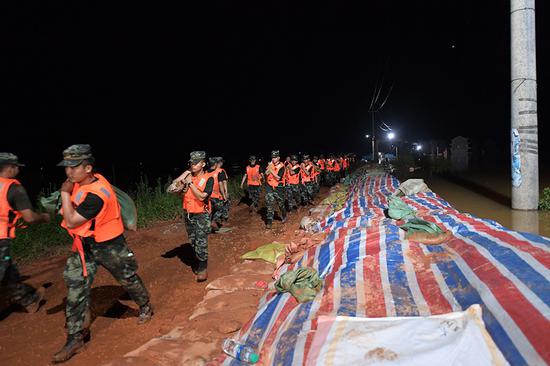 武警江西总队机动支队官兵奋战在上饶市鄱阳县江家岭村昌江圩堤坝,图为官兵正在搬运沙袋,加固堤坝