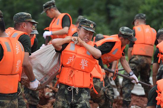 武警江西省总队相关负责人表示,7月11日晚,昌江圩江家岭村堤坝出现渗水,150多名官兵挑灯夜战至12日凌晨7时,加固堤坝1000余米,装填沙石24300袋,处置泡泉11处,封堵管涌14处,处置塌方11处,有效控制了险情。