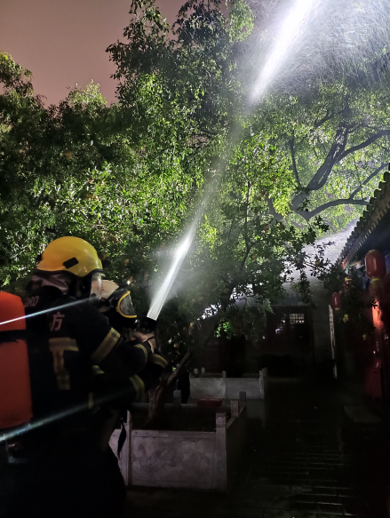 7月17日晚,北京东岳庙西廊延寿宝殿院落“树木被雷电击中起火”,“火势迅速蔓延”,即将形成“火烧连营”。北京朝阳消防救援支队迅速出动10辆消防车、58名消防指战员赶赴现场,参加这场“真刀实枪”的消防应急救援演练。