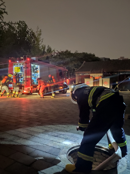 “火情”发生后,北京民俗博物馆微型消防站备勤人员,迅速赶赴现场,用灭火器和地下消防栓进行初期火灾的扑救,同时拨打119火警电话;北京朝阳消防救援支队接报火警后,立即调派朝阳门、呼家楼、红庙消防救援站10辆消防车,58名指战员赶赴“现场”。