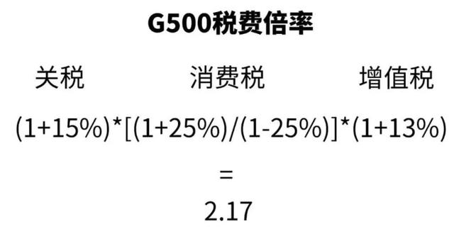 根据进口车税费结构构成,目前搭载4.0T发动机的奔驰G500指导价中除了包含25%的消费税外,还有15%的关税和13%增值税,根据最终根据公式所计算出其税费倍率等于2.17,这时再用162.88万的指导价除以2.17,也就是说新车的报关价格大约在75.05万元。