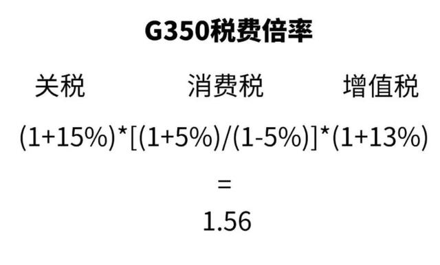 而反观搭载2.0T发动机的奔驰G350,因为消费税的降低,其税费倍率只有1.56,再算上四缸发动机和八缸发动机的成本差异,新车报关价格至少比G500车型要低10万。我们以报关价格65万为例计算,乘上1.56的税费倍率,新车最终价格或许将在93.6万左右,相比G500车型便宜了将近70万。