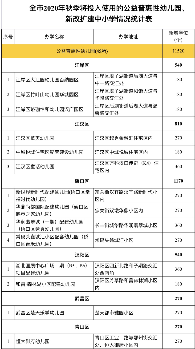 8月28日,从武汉市人民政府新闻办公室发布会上获悉,2020年秋季开学,武汉市区投资29亿元,新改扩建中小学、公益普惠性幼儿园共63所交付使用,增加供给学位约2.96万个。其中,全市预计有45所新改扩建的公益普惠性幼儿园投入使用,新增入园学位11520个;18所新改扩建的中小学投入使用,新增入学学位18057个,将有效缓解武汉市部分地区存在的学龄前幼儿“入园难、入园贵”矛盾和适龄儿童、少年就近入学难的矛盾。