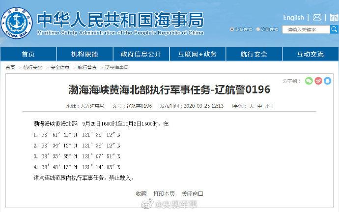 航行警告!渤海海峡黄海北部部分海域执行军事任务