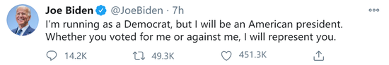 “(虽然)我现在是以民主党人的身份竞选,但我将成为美国总统。无论你们给我投的是赞成票还是反对票,我都将代表你们。”拜登在推特上写道。