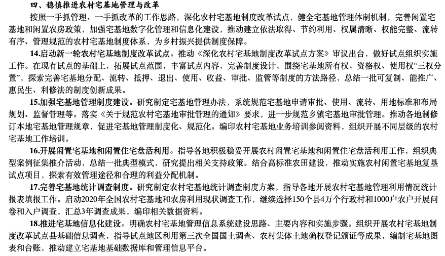 2月24日发布的《2020年农村合作经济指导司工作要点》中透露了农村宅基地改革的更多内容: