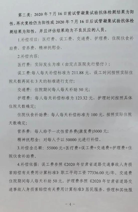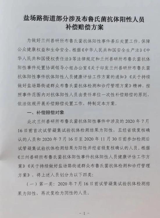 根据补偿赔偿方案,此次补偿赔偿对象为在兰州兽研所布鲁氏菌抗体阳性事件中涉及的2020年7月16日前首次试管凝集试验抗体检测结果为阳性,且经省级复核确认的人员和2020年7月16日至2020年11月30日前参加检测后试管凝集试验抗体检测结果为阳性并经省级复核确认的人员。