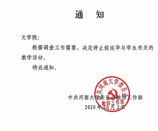 河南大学高度重视此事,本着严肃、负责的态度,成立调查组,及时跟进调查。现已停止侯运华与学生有关的教学活动,进一步的调查核实工作正在进行中。
