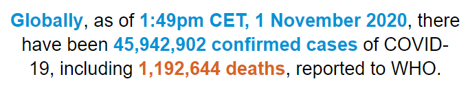 根据世卫组织最新实时统计数据,截至欧洲中部时间11月1日13时49分(北京时间11月1日20时49分),全球累计新冠肺炎确诊病例45942902例,累计死亡病例1192644例。11月1日全球新冠肺炎确诊病例新增473311例,死亡新增6578例。
