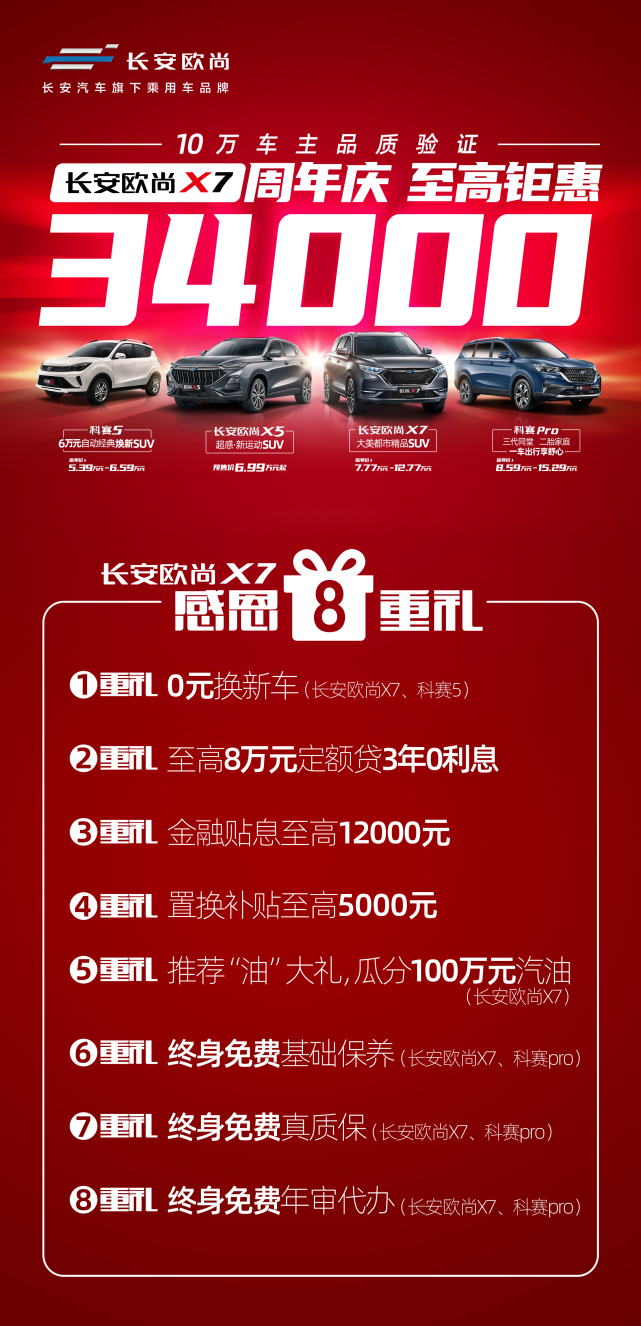 上市一周年,销量突破10万台,这是长安欧尚X7的当红一刻,也是10万车主的当红一刻。为分享这份喜悦,长安欧尚X7正式开启周年庆活动,推出感恩8重礼,至高钜惠34000元。