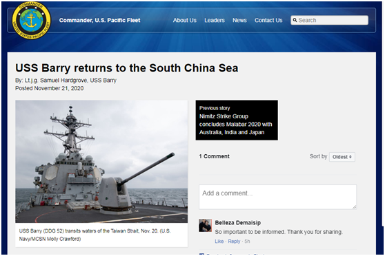 而关于“巴里号重返南海”,报道援引巴里号指挥官克里斯·盖尔(Chris Gahl)的说法,老调重弹地宣称,“持续在南海活动,对维持一个自由和开放印太地区是至关重要的,所有国家船舰在国际水域自由航行是极其重要”。