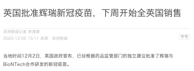 值得一提的是,据媒体报道,当地时间12月2日,英国政府宣布,已经根据药品监管部门的独立建议批准了辉瑞与BioNTech合作研发的新冠疫苗。