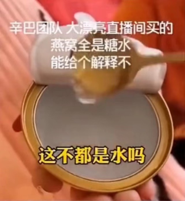 11月3日,朱琳在自己的短视频账号上发布了一段吐槽辛巴团队直播间买的燕窝,她展示了一罐打开的燕窝,并用勺子舀起,说“这是燕窝吗?这不都是水吗?你们在这跟我闹着玩吗?”此外,她在视频中配字幕称“辛巴团队时大漂亮直播间买的燕窝全是糖水,能给个解释不?”随后,这段视频被广泛转载传播,有网友称自己在辛巴团队也买了这款燕窝,也说这种情况,但也有网友质疑朱琳发布的视频不实,怀疑她自己把燕窝吃了剩下糖水拍出来,用于黑辛巴团队。后来,朱琳又发了一段燕窝开罐视频,并澄清自己没有黑谁的意思。