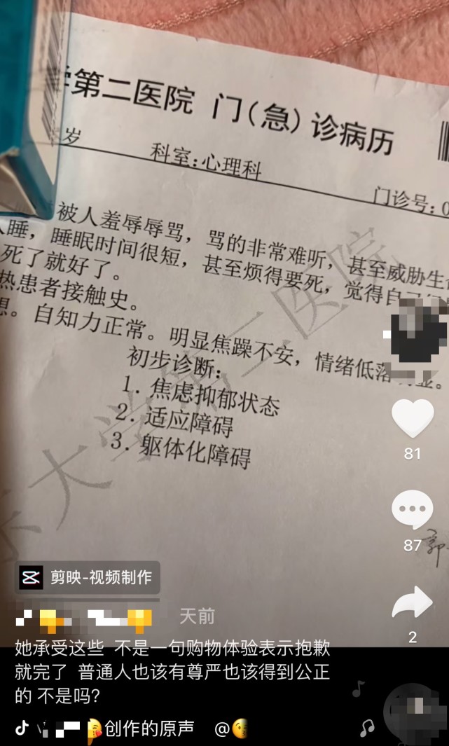 在网络暴力下,朱琳把自己发布的两条视频删除,并删除包含个人信息的其他视频。朱琳告诉北青-北京头条记者,她原本身体就不太好,买燕窝吃也是希望提高自己的身体免疫力,但她万万没想到,自己会因为一条小视频遭到网络暴力。事发后,她暂停了工作,不敢出门,除了生活工作受影响,身体状况也受到了影响。“被网暴的这段时间,我焦虑的时候,站不住,腿会发抖,我家人带我去看医生,被诊断为焦虑抑郁状态、适应障碍、躯体化障碍,医生给开了药,现在还在吃药呢。我以前不知道为什么会有人因抑郁自杀,自己被网暴了之后才理解,我作为一个普通人真的是有苦难言,觉得很委屈。”