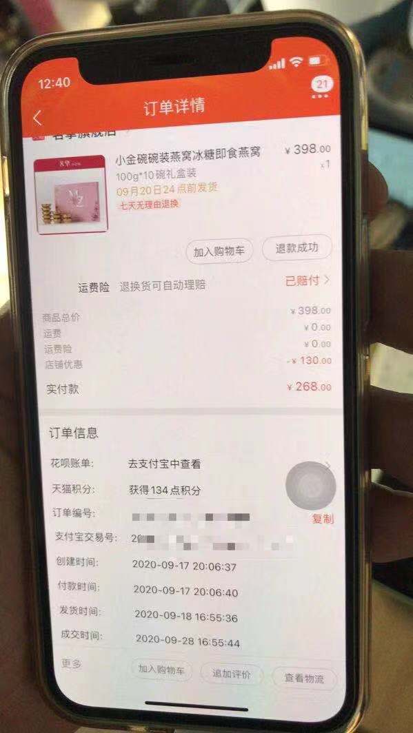 在辛巴团队承诺退一赔三后,目前已有部分消费者收到赔付。一名收到赔付的网友告诉北青-北京头条记者,他是今年9月中旬在“时大漂亮”直播间买到这款燕窝的,10碗、每碗100克的礼盒装冰糖即时燕窝268元。“在辛巴团队说退一赔三之后,我也申请了赔款,但接单的品牌方不管,让找辛巴退。最后,没吃完的燕窝品牌方给退货退款了,辛巴团队确实也给退了实付款的4倍,我11月29日就收到1072元赔付。”此外,据该店铺在售风味燕窝饮品产品参数显示,该产品的生产厂为大洲新燕(厦门)生物科技有限公司。