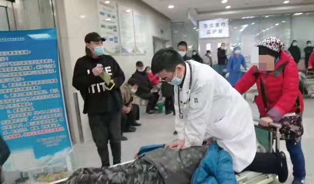 当天正是大雪节气,沈阳的最低温度达到-14℃,赵宏宇来不及披上外衣,便跑到了患者倒地处,“到楼外以后发现患者倒地,从我多年的临床经验判断,这个患者可能是心脏骤停了。”发现患者也没有颈动脉搏动,赵宏宇立即进行了心肺复苏和标准的心脏按压。医院平板车一赶到,赵宏宇跳上车继续心脏按压,家属和工作人员将平板车护迅速送到急诊抢救室。