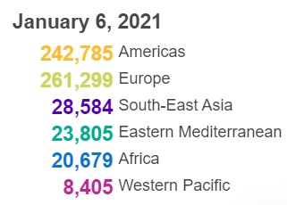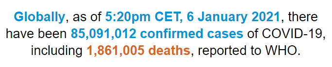 根据世卫组织最新实时统计数据,截至欧洲中部时间1月6日17时20分(北京时间1月7日0时20分),全球累计新冠肺炎确诊病例85091012例,累计死亡病例1861005例。