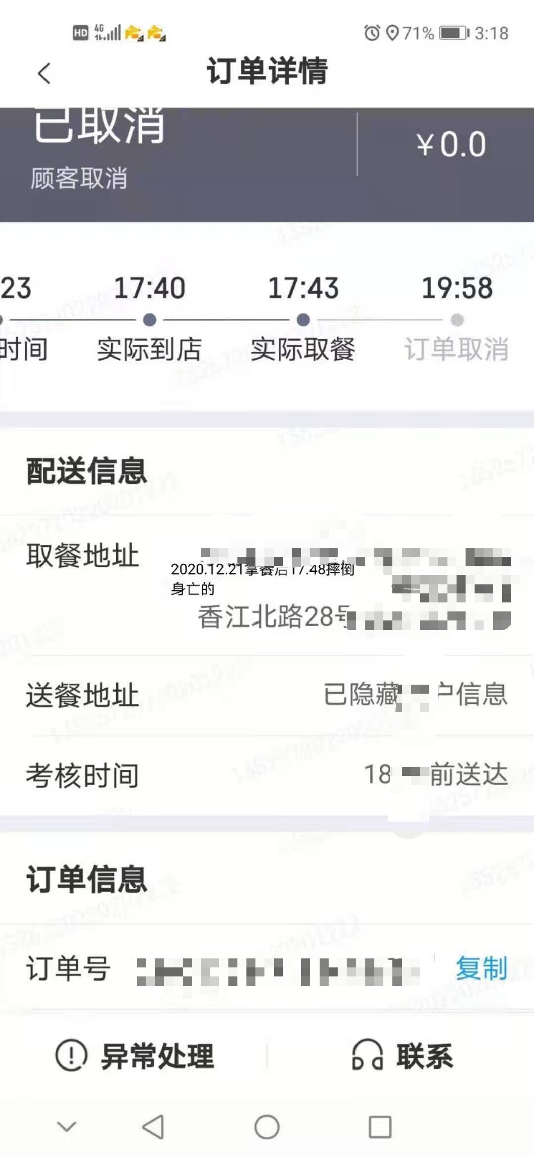 直到19点58分,迟迟等不到外卖的平台用户,终于取消了这则订单。