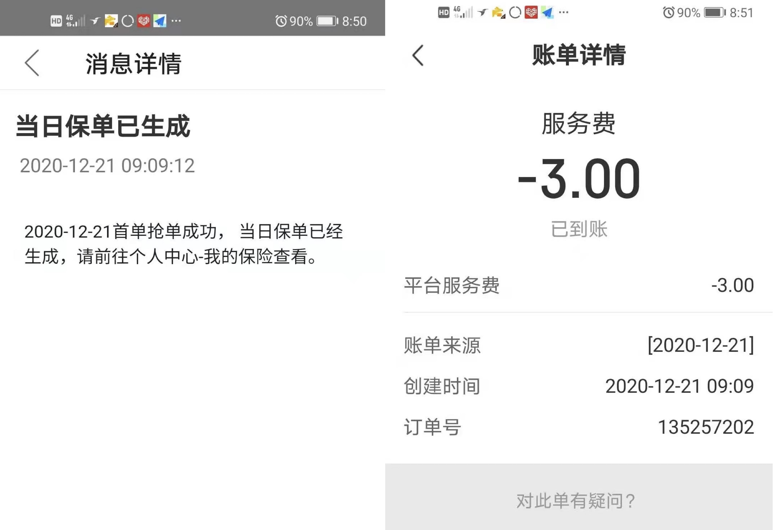2020年12月21日8时许,43岁的老韩利落地穿好蓝色的饿了么工作服,像往常一样,快速跨上摩托车出发。9点09分,用完早餐的老韩抢到当天第一单。在抢单成功后,系统扣除了老韩3元的服务费,生成了当日保单。