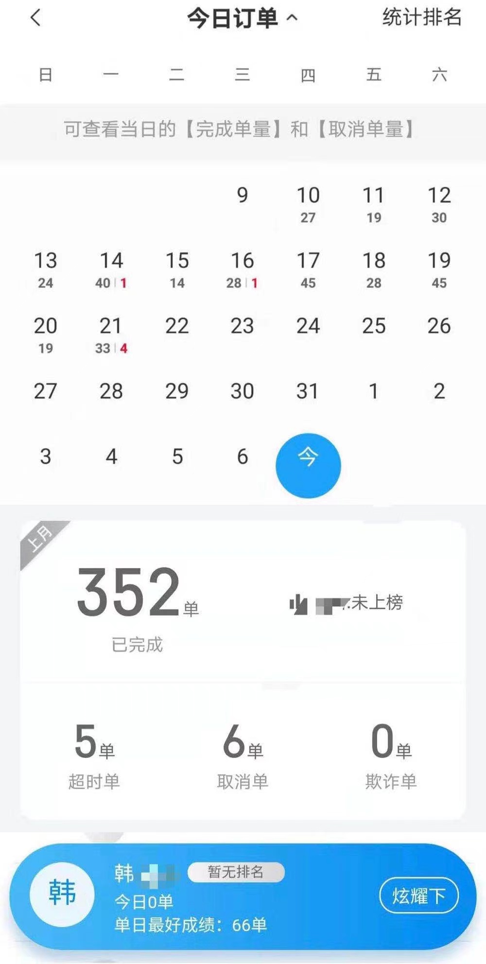 12月初,因家中有事,老韩曾请假回老家,有9天没有工作。据老韩弟弟韩明(化名)提供的平台软件截图显示,从12月10日至12月21日,老韩共完成了352单,平均每天完成29.3单。