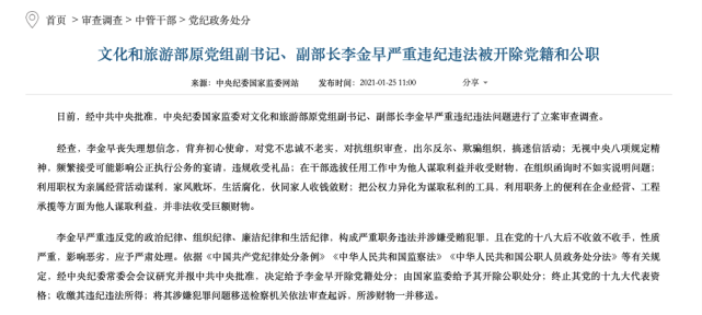 1月25日,中央纪委国家监委官网发布消息,文化和旅游部原党组副书记、副部长李金早严重违纪违法被双开。