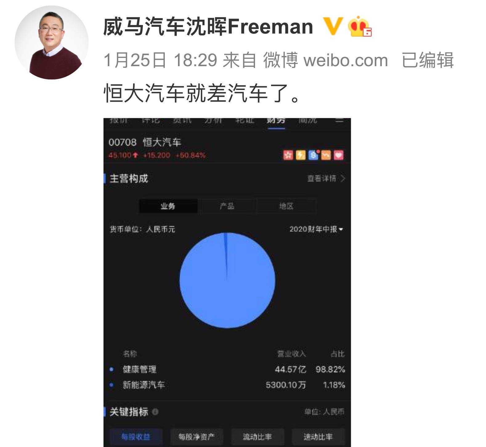 1月25日,恒大汽车宣布引入260亿元战略投资,消息一出,当日恒大汽车港股股价大涨超50%,总市值接近4000亿港元(约合人民币3300亿元)。沈晖也很关注潜在对手,当天就在微博发了一条2020年恒大汽车年中财报的截图,并附上评论称:“恒大汽车就差汽车了”。