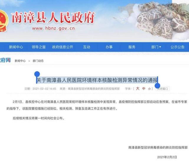 2月2日,湖北省南漳县人民政府官网发布一则关于南漳县人民医院环境样本核酸检测异常情况的通报。