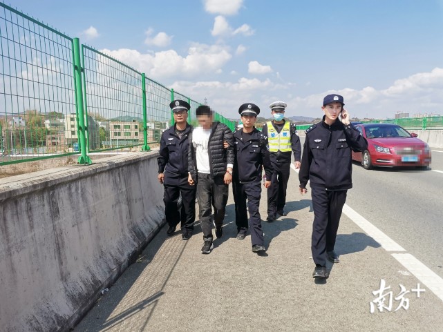 通过不断与男子谈心交流稳住其情绪,民警了解到:该男子叫罗某伟,系河南省潢川县人,大年初一他就陪妻子回娘家,到了横陂镇叶湖村岳父母家,期间因家庭纠纷与妻子发生争吵。2月14日8时许,罗某伟一时想不开,就驾驶小汽车来到横陂镇叶湖村靠近高速公路的一山坡旁,后从山坡上步行至高速公路上,欲跳桥轻生。