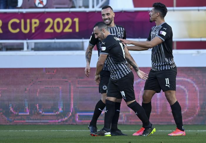 2月26日,阿尔萨德队球员巴格达(右)在进球后和队友庆祝。