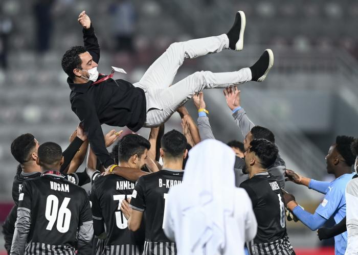 2月26日,阿尔萨德队主教练哈维(上)在比赛后被球员抛向空中。当日,在卡塔尔首都多哈进行的2021年卡塔尔杯足球赛决赛中,阿尔萨德队以2比0战胜阿尔杜海勒队,夺得冠军。