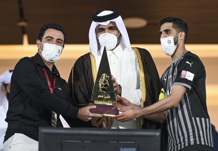 2月26日,阿尔萨德队主教练哈维(左)和队长哈桑(右)捧起奖杯。