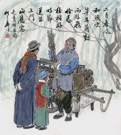 我不禁想起小时候每逢这个时节,经常能在北京各大庙会看到卖树苗儿的摊贩,也有的推车进胡同吆喝卖。他们都是从周边农村来的,把育好的树苗包裹好根部,在开春时节推车进城。北京人爱树是出了名的,这不仅是需要它遮阳纳凉、美化环境,还因为植物是有生命之物,人们将它视为自己生活中的一部分,赋予了它灵气,也就有了求福心理和说头儿。