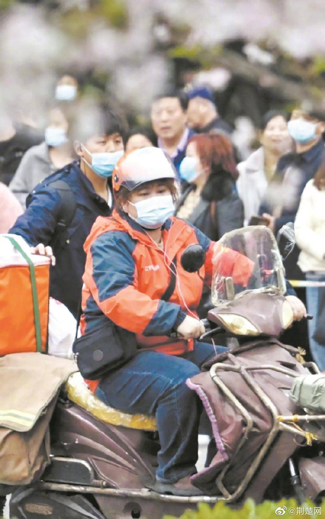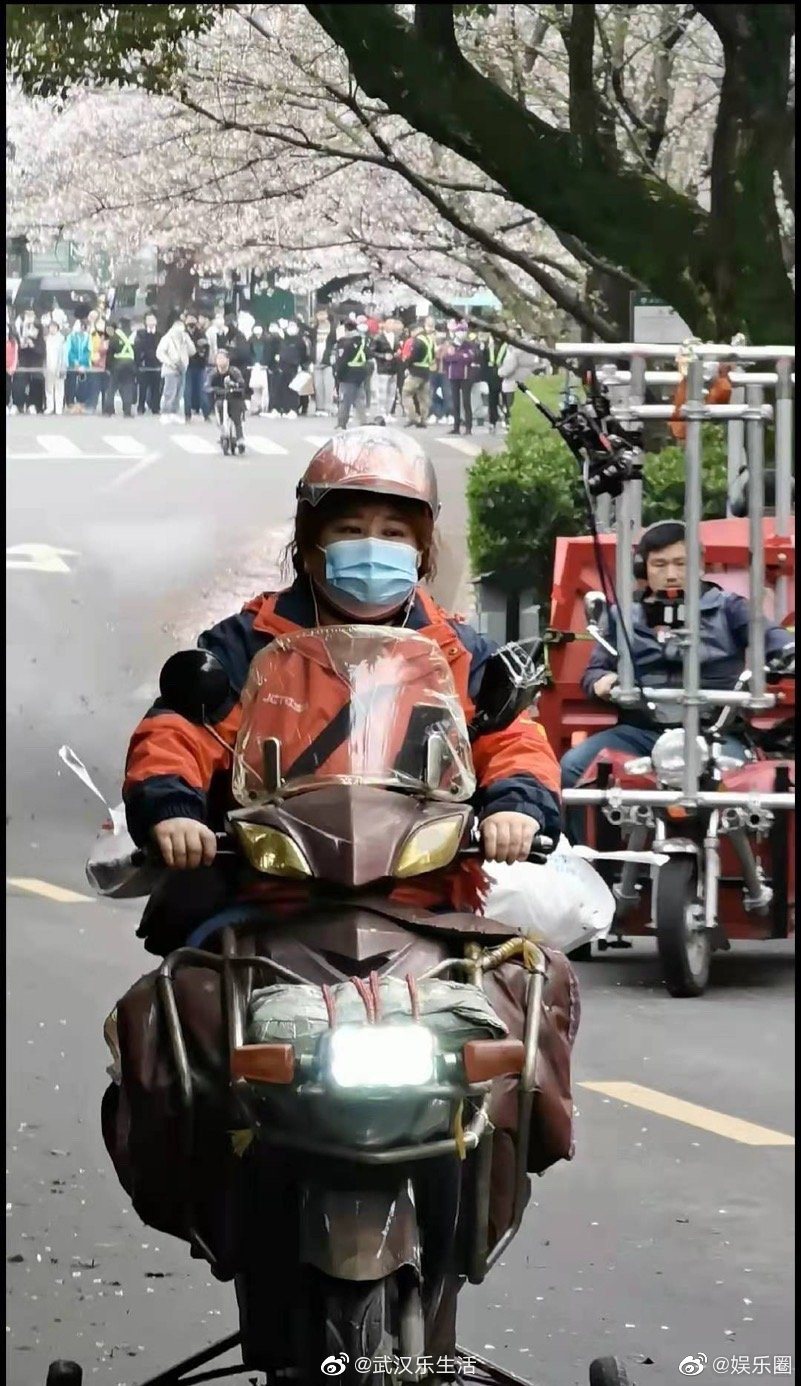 从网友曝光的现场照可以看出,贾玲这次扮演一名快递员,她戴着头盔骑着电动车,扮相十分接地气,而且背景是武汉大学盛开的樱花。