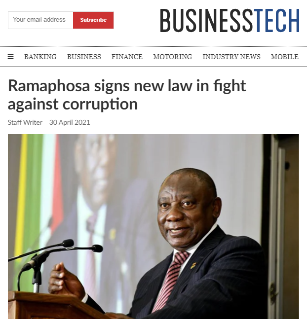据南非媒体当地时间4月30日报道,南非总统拉马福萨已签署《审计职业修正案》,并使之成为法律,作为打击该国政府部门及私营机构腐败行为的重要工具。