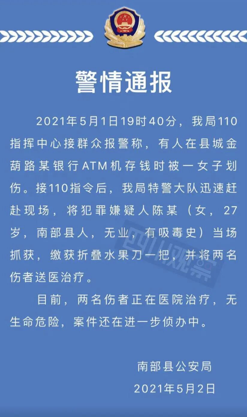 5月1日晚上19:40分左右,南充市南部县发生一起持刀伤人的案件,两名群众在银行存钱时,被一女性嫌疑人持刀划伤。嫌疑人被火速赶到现场的特警抓获。