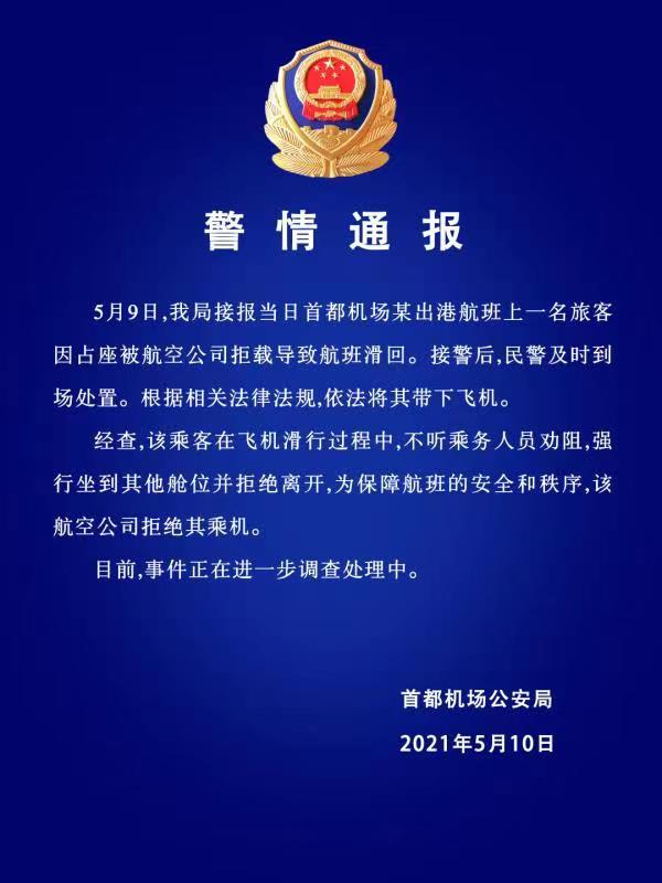 首都机场公安局2021年5月10日通报称,5月9日,该局接报当日首都机场某出港航班上一名旅客因占座被航空公司拒载导致航班滑回。接警后,民警及时到场处置。根据相关法律法规,依法将其带下飞机。