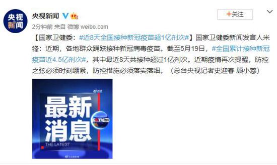 国家卫健委:近8天全国接种新冠疫苗超1亿剂次