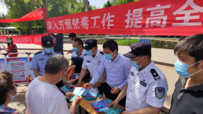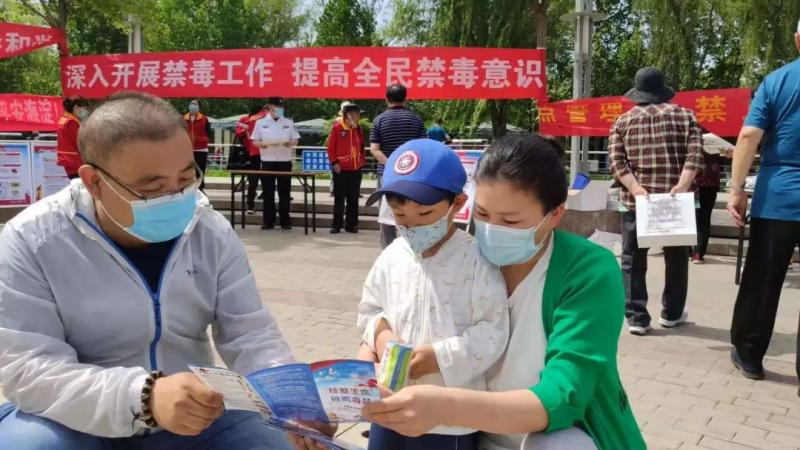 永定路街道办事处副主任张立带领平安建设办公室的工作人员,在公园广场中央设置了专门的活动会场,通过发放禁毒宣传折页、宣传品、摆放知识展板、向居民进行禁毒知识科普。永定路派出所的民警向参加活动的居民宣传讲解了我国在禁毒方面的主要法规,并提醒广大群众,如发现种毒、吸毒、贩毒等情况,要敢于向相关部门举报,号召大家一起努力打击违法犯罪。