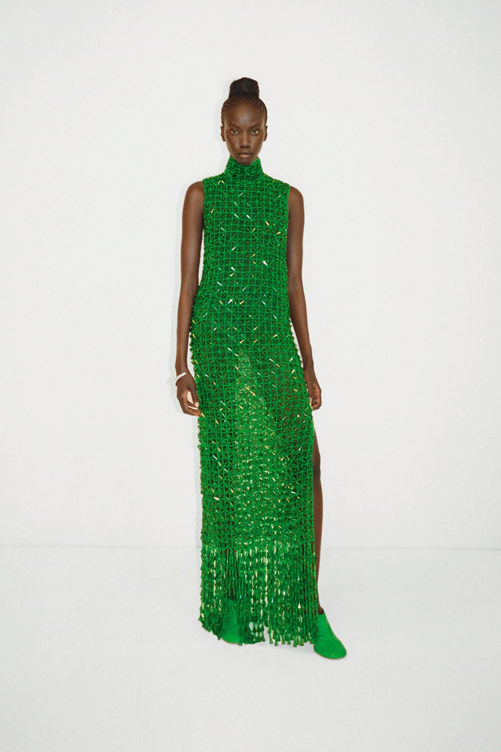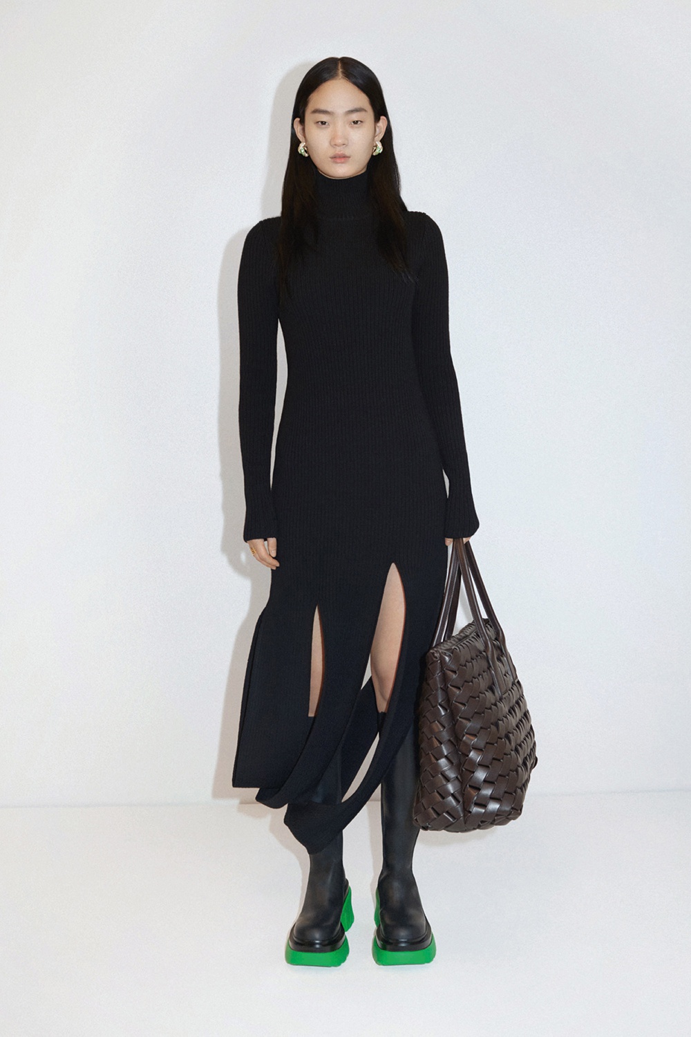 “Wardrobe 02”中的毛巾针织连衣裙和长袍,发挥了 Daniel Lee 所崇尚的“家居”之感。驼色、黑色、灰色和白色等中性色调与 BOTTEGA VENETA 的绿色、金丝雀黄、红色和青蓝色形成鲜明对比。从拉丝羊毛到羽毛连体套装和褶皱连衣裙,此系列探索了纹理和折衷主义的巧妙玩法,同时注入多款易于穿着的日常单品,如高领毛衣、羊绒衫和针织裙等。