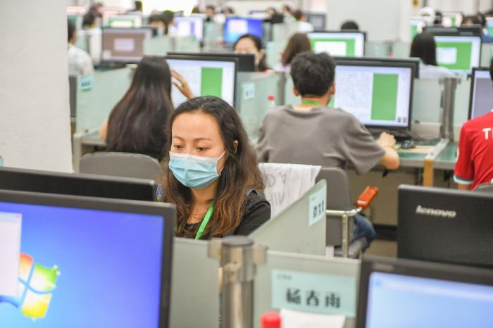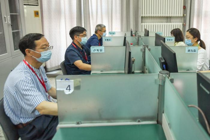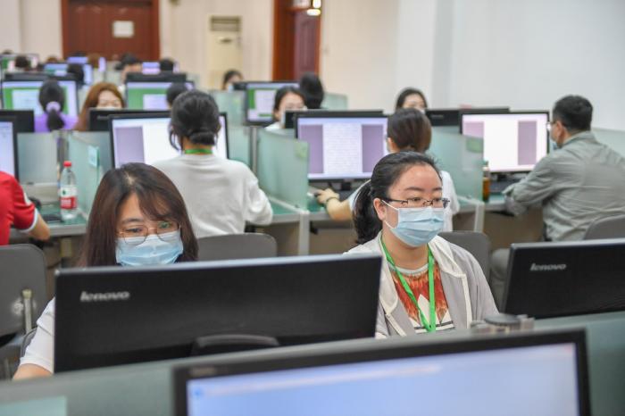 6月16日,在东北师范大学,工作人员在进行阅卷。当日,吉林省2021年高考阅卷工作向媒体开放,接受社会监督。2021年吉林省高考阅卷工作全部采用电子扫描、网上阅卷方式进行。