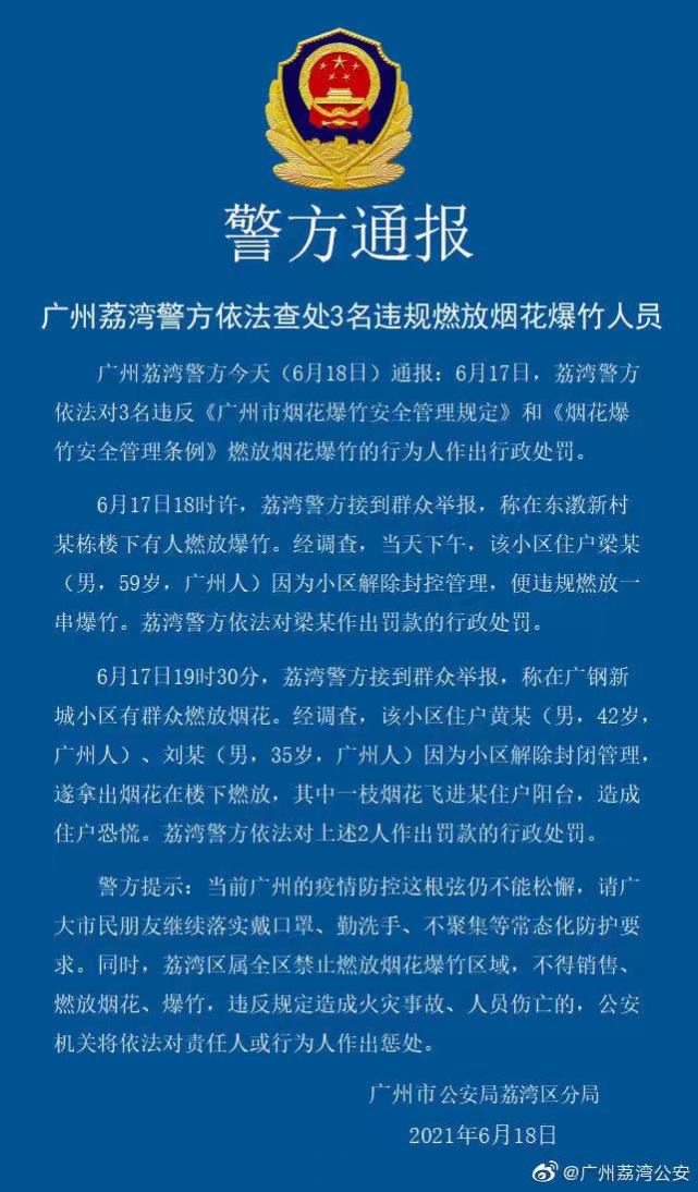 广州荔湾警方6月18日通报称,6月17日,荔湾警方依法对3名违反《广州市烟花爆竹安全管理规定》和《烟花爆竹安全管理条例》燃放烟花爆竹的行为人作出行政处罚。