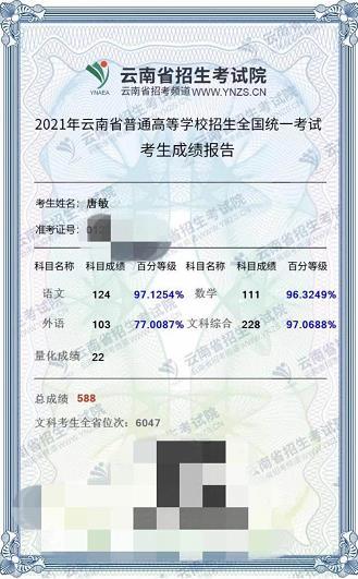 2008年,8岁的唐敏为救弟弟冲进火场失去了四肢。今年,这位浴火重生的云南女孩走上了高考考场,并考出了588分的好成绩,超出云南省文史类一本线23分。25日,唐敏告诉北青-北京头条记者,一开始得知成绩时她非常激动,但后来看了下各部分小分时又觉得英语和语文没有发挥好,成绩还能够提高。