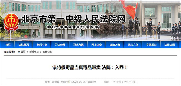 6月26日,北京市第一中级人民法院网披露一起案例,两名男子想贩毒却买了假货,被抓后判刑。