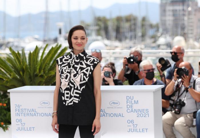 7月6日,法国影片《安妮特》主创人员、法国演员玛丽昂·科蒂亚尔在法国戛纳出席电影节拍照式。