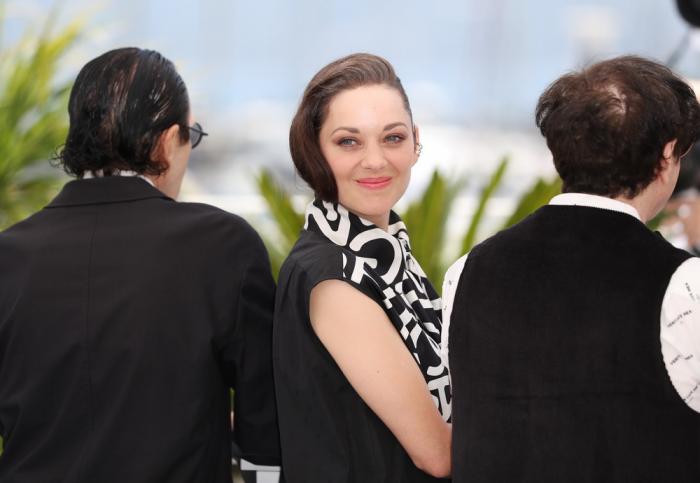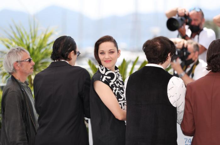 7月6日,法国影片《安妮特》主创人员、法国演员玛丽昂·科蒂亚尔(中)在法国戛纳出席电影节拍照式。
