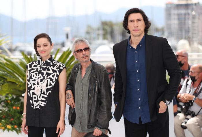 7月6日,法国影片《安妮特》主创人员在法国戛纳出席电影节拍照式,从左至右:法国演员玛丽昂·科蒂亚尔、法国导演莱奥·卡拉、美国演员亚当·德里弗。