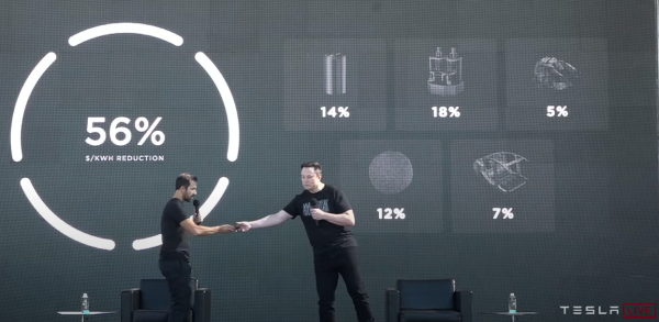 更让人惊讶的是,马斯克表示更加简洁、对加工要求更低的无极耳设计让4680电芯的每千瓦时成本下降了14%。再结合生产工艺、电极材料、车身整合等方面的优化,4680电池的每千瓦时成本比2170电池低56%。