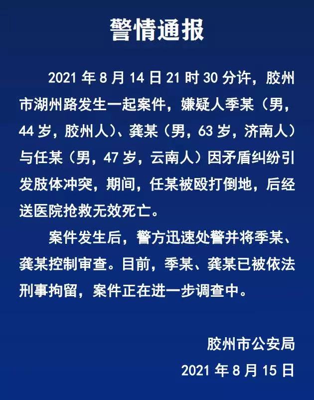 山东胶州市公安局8月15日发布一则警情通报:2021年8月14日21时30分许,胶州市湖州路发生一起案件,嫌疑人季某(男,44岁,胶州人)、龚某(男,63岁,济南人)与任某(男,47岁,云南人)因矛盾纠纷引发肢体冲突,期间,任某被殴打倒地,后经送医院抢救无效死亡。
