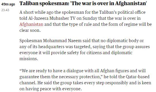 英国《卫报》报道,阿富汗塔利班发言人穆罕默德·纳伊姆当地时间15日告诉半岛电视台,在阿富汗,战争已经结束,政权形式等很快就会明朗。